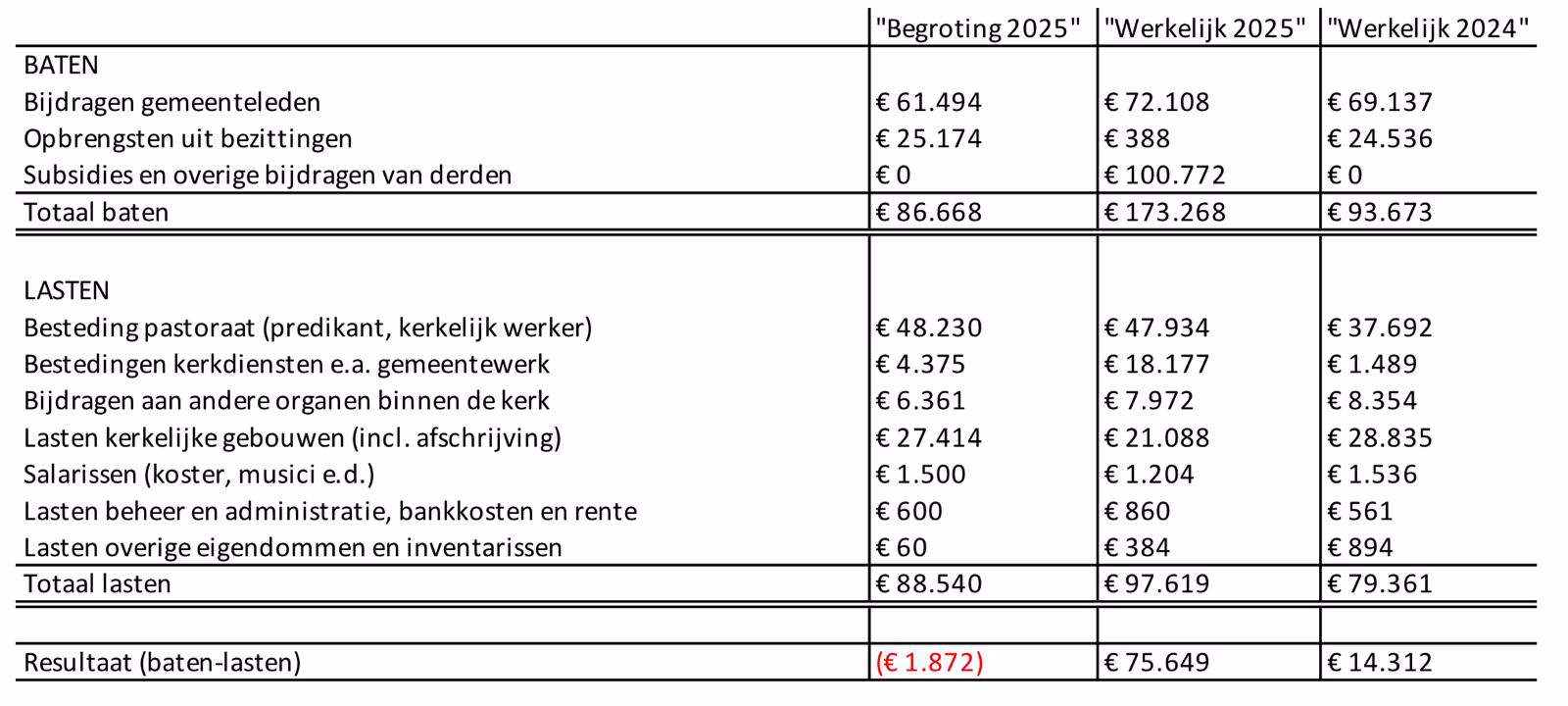 Onderstaande staat van baten en lasten geeft via de kolom ‘begroting’ inzicht in de begrote ontvangsten en de voorgenomen bestedingen in het verslagjaar. De kolom ‘werkelijk’ geeft inzicht in de gerealiseerde ontvangsten en bestedingen.